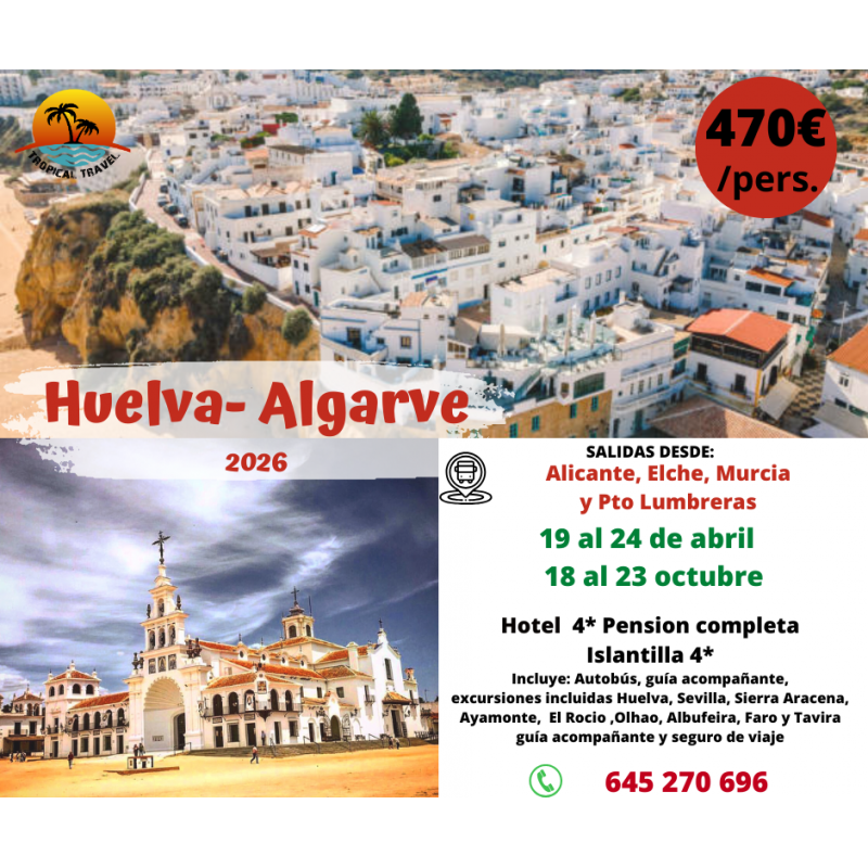 Viaje a Huelva y Algarve desde Alicante, Elche, Murcia y granada