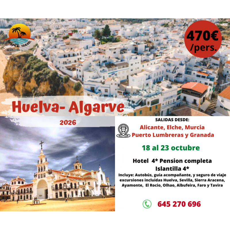 - Excursiones incluidas: Huelva, Sevilla, Sierra Aracena, Ayamonte, El Rocío, Olhao, Albufeira, Faro y Tavira.